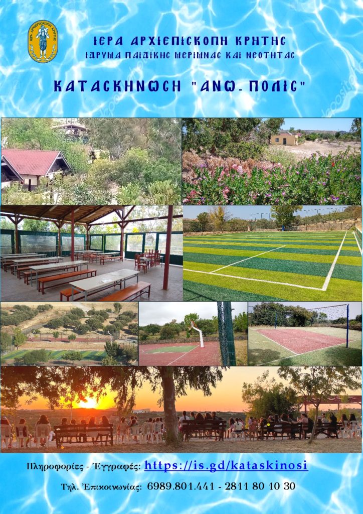 Με ιδιαίτερη χαρά σας ενημερώνουμε ότι θα λειτουργήσουν και εφέτος οι Κατασκηνώσεις «ΑΝΩ ΠΟΛΙΣ» της Ιεράς Αρχιεπισκοπής Κρήτης στην Ανώπολη Πεδιάδος, οι οποίες είναι έτοιμες να υποδεχθούν ξανά τους μικρούς μας φίλους στις ανακαινισμένες εγκαταστάσεις τους και να γίνουν τόπος συνάντησης, παιχνιδιού, χαράς, ξεκούρασης, γνωριμίας με τη φύση αλλά και πνευματικής αναγέννησης στην Ορθόδοξη παράδοσή μας, μακριά από την πολύβουη και μονότονη καθημερινότητα των πόλεων.