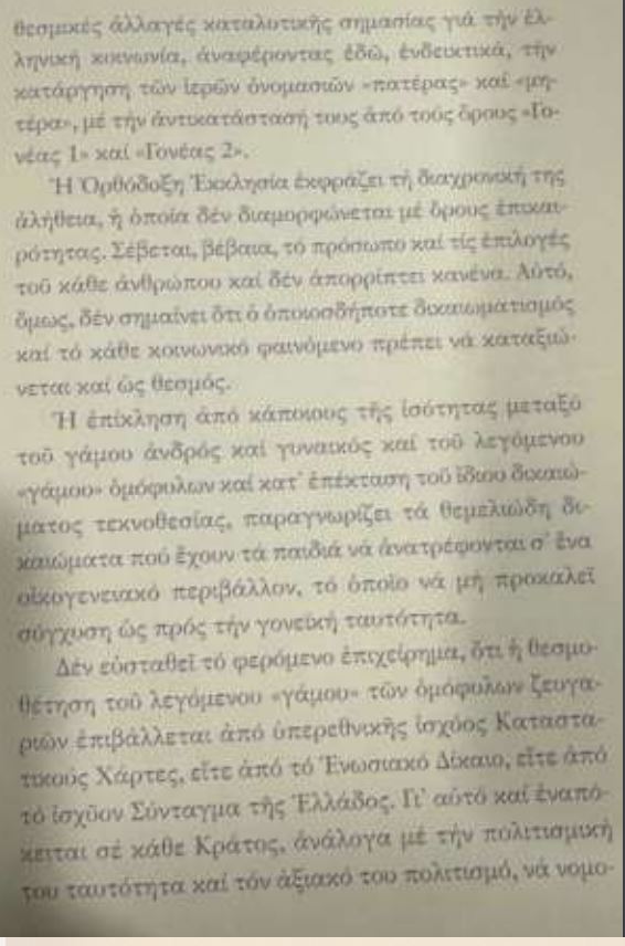«Για την Χριστιανική πίστη, ο ιερός θεσμός της οικογένειας συνδέεται άμεσα με τα διακριτά πρότυπα του ατέρα και της μητέρας, όπως επιβεβαιώνει η θειϊκή εντολή “Τίμα τον πατέρα σου και την μητέρα σου”, και τούτο το παιδί έχει αναφορά σε αυτούς. Ο οποιοσδήποτε ουδέτερος προσδιορισμός των σχέσεων αυτών καταλύει τον φυσικό δεσμό της οικογένειας, αναδεικνύοντας στο όνομα ενός μονομερούς και μειοψηφικού «δικαιωματισμού» καινοφανείς κοινωνικούς θεσμούς», υπογραμμίζεται.