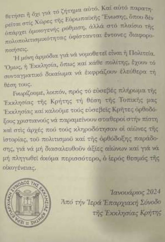 Η Ιερά Επαρχιακή Σύνοδος της Εκκλησίας της Κρήτης δημοσίευσε ενημερωτικό φυλλάδιο προς το ευσεβές πλήρωμα της Εκκλησίας της Κρήτης με αφορμή το προς ψήφιση νομοσχέδιο για τον λεγόμενο γάμο ομόφυλων ζευγαριών.