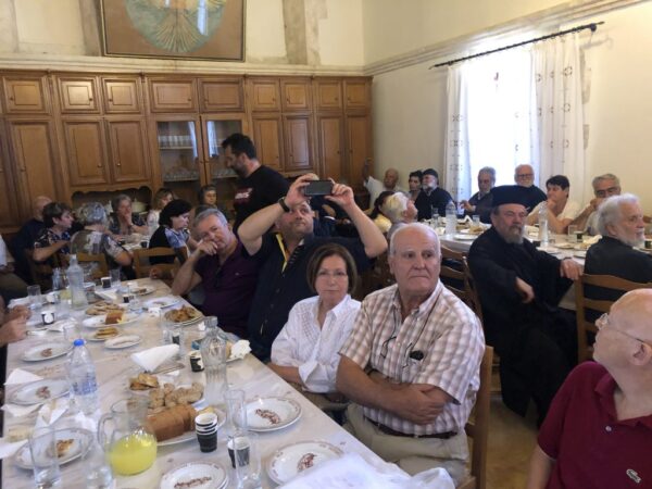 Στην προσφώνηση ο Πρόεδρος του Συνδέσμου Αποφοίτων Εκκλησιαστικής Σχολής Κρήτης ” η Αγία Τριάς”, Πρωτ. Αντώνιος Σαπουνάκης καλωσόρισε τους Σεβασμιωτάτους Αρχιερείς και όλους τους παρευρισκομένους, ενώ ευχαρίστησε τον Σεββασμιώτατο κ. Δαμασκηνό για την ευλογία της ετήσιας Συνάξεως καθώς τον Πανοσιολογιώτατο Πρωτοσύγκελλο Αρχιμ. Δαμασκηνό Λιονάκη, για τον συντονισμό της ημερίδος, καθώς και όλη την Αδελφότητα της Ιεράς Μονής.Στην Τραπεζαρία της Ιεράς Μονής συνεχίστηκαν οι ομιλίες και οι δίαλογοι μεταξύ των αποφοίτων οι οποίοι μαζεύτηκαν από διάφορα μέρη της Κρήτης και της Ελλάδος για να δώσουν το παρών και στην φετινή ημερίδα.