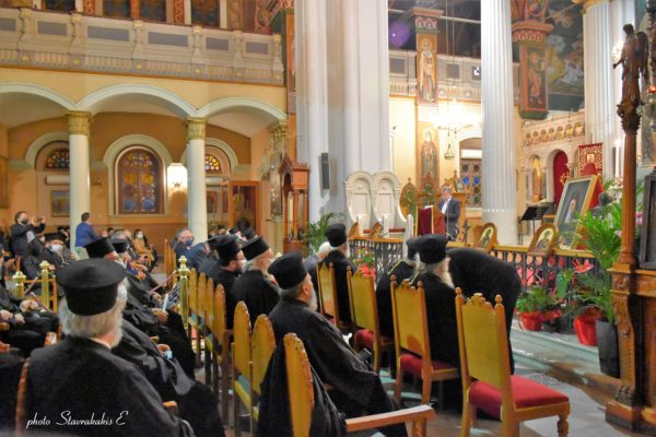Σήμερα όλοι εμείς, που αγαπούμε τη Μητέρα μας Εκκλησία και το Σεπτό Πρόσωπο του πολυφίλητου Πατέρα και Πατριάρχη μας, οι Αρχιερείς της Μεγαλονήσου Κρήτης, της ναυαρχίδος του Οικουμενικού Πατριαρχείου, όπως έχει χαρακτηρισθεί, ο Ιερός Κλήρος, οι Μοναστικές Αδελφότητες και ο ευσεβής και ευγενής Λαός της λεβεντογέννας Κρήτης συμμετέχουμε στην επίσημη αυτή Συνοδική εκδήλωση και οι υπάρξεις μας πληρούνται από ευφροσύνη. Γιατί αγαπούμε τον Πατριάρχη μας και αισθανόμαστε τη δική Του αγάπη να μας συνοδεύει στο βηματισμό μας, μαζί με την Πατρική Του Ευχή και την Ευλογία Του για «όσα εστίν αληθή, όσα σεμνά, όσα δίκαια, όσα αγνά, όσα προσφιλή, όσα εύφημα».