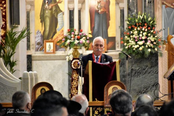 Στο χαιρετισμό είπε: «Σεβασμιώτατοι άγιοι Αρχιερείς, Εντιμολογιώτατοι Άρχοντες, Σεβαστοί Πατέρες, Αξιότιμοι κύριοι εκπρόσωποι των Αρχών του τόπου, Αγαπητά φιλοπάτορα παιδιά του Πατρός και Πατριάρχου μας κ.κ. Βαρθολομαίου, όσα βρίσκεσθε απόψε εδώ, στον Ιερό Μητροπολιτικό Ναό του Αγίου Μεγαλομάρτυρος Μηνά, αλλά και όσα μέσω ραδιοφώνου και διαδικτύου είσθε παρόντα.