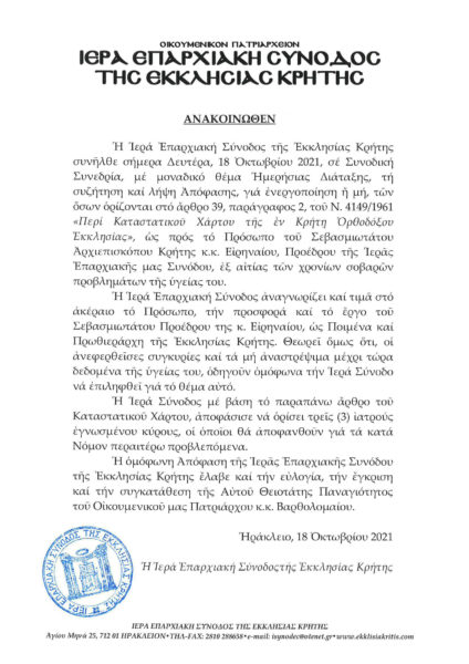 Ἡ Ἱερά Ἐπαρχιακή Σύνοδος τῆς Ἐκκλησίας Κρήτης συνῆλθε σήμερα Δευτέρα, 18 Ὀκτωβρίου 2021, σέ Συνοδική Συνεδρία, μέ μοναδικό θέμα Ἡμερήσιας Διάταξης, τή συζήτηση καί λήψη Ἀπόφασης, γιά ἐνεργοποίηση ἤ μή, τῶν ὅσων ὁρίζονται στό ἄρθρο 39, παράγραφος 2, τοῦ Ν. 4149/1961 «Περί Καταστατικοῦ Χάρτου τῆς ἐν Κρήτῃ Ὀρθοδόξου Ἐκκλησίας», ὡς πρός τό Πρόσωπο τοῦ Σεβασμιωτάτου Ἀρχιεπισκόπου Κρήτης κ.κ. Εἰρηναίου, Προέδρου τῆς Ἱερᾶς Ἐπαρχιακῆς μας Συνόδου, ἐξ αἰτίας τῶν χρονίων σοβαρῶν προβλημάτων τῆς ὑγείας του.