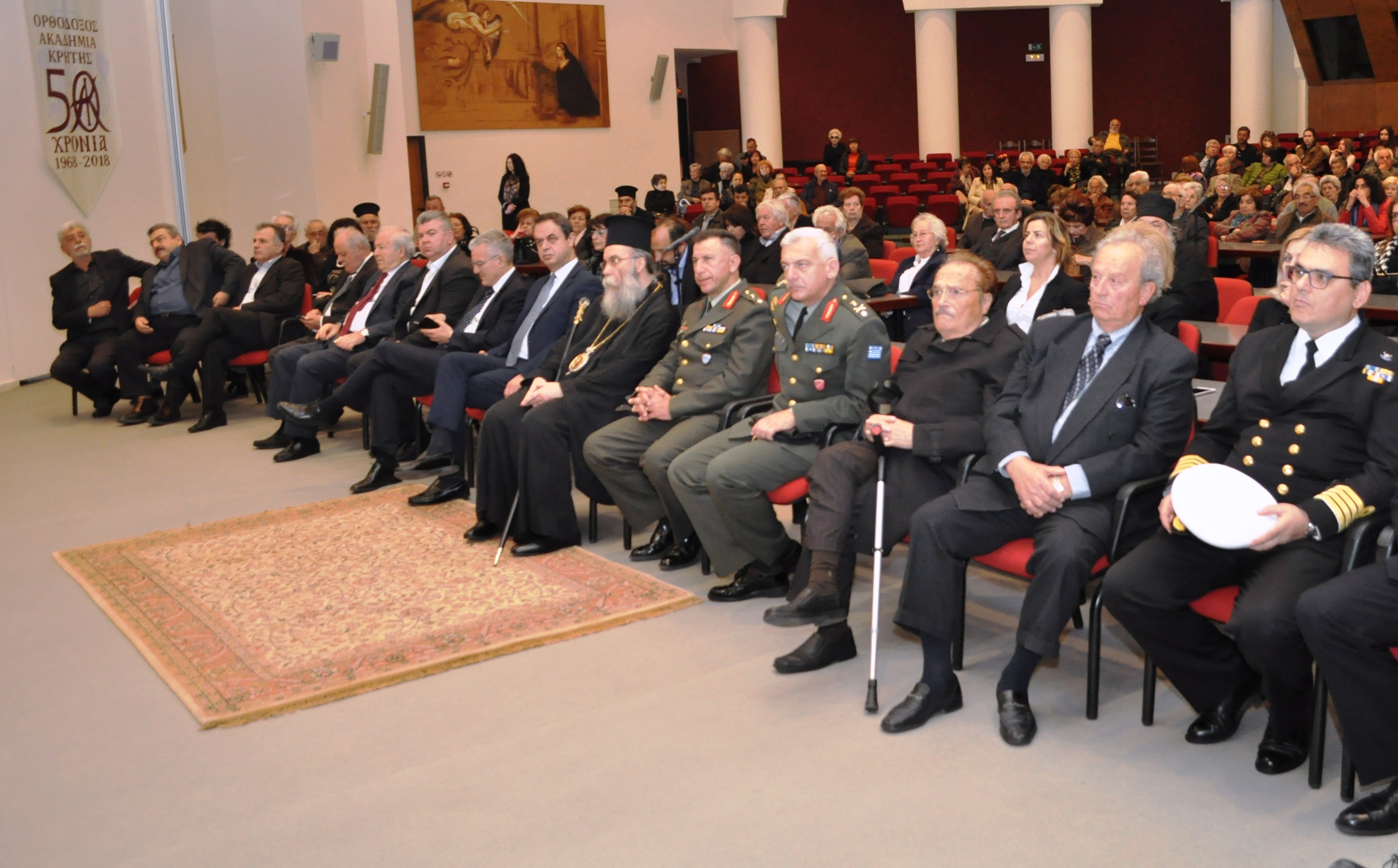 Στη συνέχεια πραγματοποιήθηκε η καθιερωμένη επίσημη εορτή του Ιδρύματος, με τον συντονισμό της Επιστημονικής Συνεργάτιδας του Ιδρύματος κας Εμμανουέλας Λαρεντζάκη, και με κεντρικό ομιλητή τον Δρ Κωνσταντίνο Ζορμπά, Γενικό Διευθυντή της ΟΑΚ, με θέμα: «Οἱ Προφῆται ὡς εἶδον, οἱ Ἀπόστολοι ὡς ἐδίδαξαν, ἡ Ἐκκλησία ὡς παρέλαβε…»: Τό ἔργο καί ἡ μαρτυρία τῆς Ὀρθοδόξου Ἀκαδημίας Κρήτης ὡς συνέχεια τῆς Ὁμολογίας τῶν Πατέρων τῆς 7ης Οἰκουμενικῆς Συνόδου. Ο κ. Ζορμπάς στην ομιλία του αναφέρθηκε στην 50ετή πορεία της ΟΑΚ, εξέφρασε τη βαθιά ευγνωμοσύνη του Ιδρύματος προς τον Παναγιώτατο Οικουμενικό Πατριάρχη κ.κ. Βαρθολομαίο Α΄, τον και πνευματικό προστάτη της ΟΑΚ και κατέθεσε επίκαιρους προβληματισμούς. Αναφέρθηκε σε μαρτυρίες σημαντικών προσωπικοτήτων για το έργο της ΟΑΚ και τόνισε ότι το έργο των Ακαδημιών είναι πολύτιμο εργαλείο στα χέρια της Εκκλησίας και της Κοινωνίας για την προώθηση του διαλόγου και «εάν δεν υπήρχε η Ακαδημία θα έπρεπε να την είχαμε δημιουργήσει σήμερα».