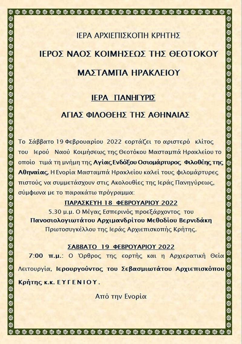 Ειδικότερα, το Σάββατο 19 Φεβρουαρίου εορτάζει το αριστερό κλίτος του Ιερού Ναού Κοιμήσεως της Θεοτόκου Μασταμπά Ηρακλείου, το οποίο τιμά τη μνήμη της Αγίας Ενδόξου Οσιομάρτυρος Φιλοθέης της Αθηναίας.