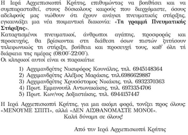 Η Ιερά Αρχιεπισκοπή Κρήτης επιθυμώντας να βοηθήσει και να συμπαρασταθεί στους δύσκολους καιρούς που διερχόμαστε υπό την απειλή της εξαπλώσεως του ιού του κορονοϊού και την αναστολή τέλεσης ιεροπραξιών σε όλη την ελληνική επικράτεια, εγκαινιάζει μία νέα ποιμαντική διακονία, την “ΓΡΑΜΜΗ ΠΝΕΥΜΑΤΙΚΗΣ ΣΤΗΡΙΞΗΣ”. Κατηρτισμένοι πνευματικοί θα βρίσκονται στη διάθεση όσων πιστών ζητήσουν τηλεφωνικώς αυτού του ειδους την υποστήριξη.