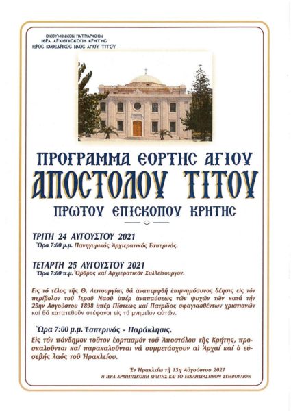 Την Τετάρτη 25 Αυγούστου στον ομώνυμο Καθεδρικό Ναό του Αγίου Τίτου στις 7:00π.μ. θα πραγματοποιηθεί Όρθρος και Αρχιερατικό Συλλείτουργο.