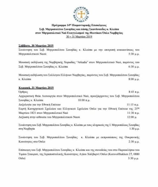 Επισυνάπτουμε το Πρόγραμμα της 14ης Ποιμαντορικής Επίσκεψης του Σεβ. Μητροπολίτου Σουηδίας, κ. Κλεόπα, στον Μητροπολιτικό Ναό του Ευαγγελισμού της Θεοτόκου Όσλο, κατά τις 30-31 Μαρτίου 2019.
