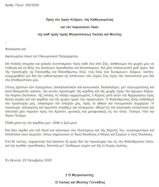 Στις 3 Οκτωβρίου ο εκδημήσας -προ ολίγου- εις Κύριον Μητροπολίτης Ιταλίας και Μελίτης κυρός Γεννάδιος είχε στείλει ευχαριστήρια επιστολή προς «τον Ιερόν Κλήρον, τας Καθηγουμένας και τον περιούσιον Λαόν της Ιεράς Μητροπόλεως Ιταλίας καί Μελίτης», που του ευχήθηκαν για την αποθεραπεία του…