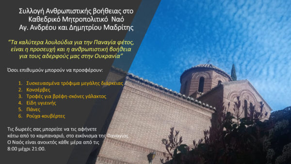 Ανθρωπιστική βοήθεια για τον δοκιμαζόμενο Ουκρανικό λαό συγκεντρώνεται στον Καθεδρικό Ναό Αγίων Ανδρέου και Δημητρίου Μαδρίτης, όπως γνωστοποιεί με ανακοίνωση της η Ιερά Μητρόπολη Ισπανίας και Πορτογαλίας.