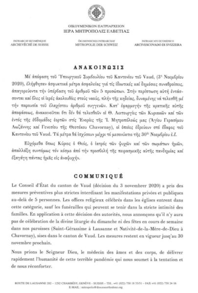 Αναλυτικά η ανακοίνωση της Ιεράς Μητροπόλεως Ελβετίας: