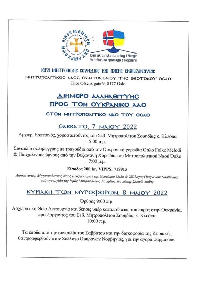 Συναυλία αλληλεγγύης με Ουκρανικά τραγούδια από την FolkeMelodi (Ουκρανική χορωδία στο Όσλο) και Πασχαλινούς ύμνους από την Βυζαντινή χορωδία του Μητροπολιτικού Ναού Ευαγγελισμού της Θεοτόκου Όσλο 7:00 μ.μ. Είσοδος 200 kr, VIPPS: 718915