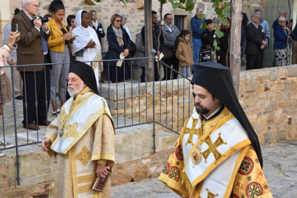 Ο Μητροπολίτης Γαλλίας στην ομιλία του συνέδεσε τα εγκαίνια του Καθολικού με τα εγκαίνια ενός νέου τρόπου ζωής για όλους μας. Μια ζωή απαλλαγμένη από τα πάθη και τις αγκυλώσεις που μας στερούν την εν Χριστώ ζωή. Εξέφρασε την πνευματική κατάνυξη που νιώθει ως ποιμένας, να τον αξιώνει ο Θεός να τελεί τα εγκαίνια αυτά, εκφράζοντας την αγάπη του για την αδελφότητα και τις ακατάπαυστες προσπάθειες της Ι. Μητροπόλεως Γαλλίας να αναπτύξει σε όλες τις γωνιές της χώρας τον ορθόδοξο μοναχισμό, ιδρύοντας συνεχώς νέες Ι. Μόνες. Χαρακτηριστικά είπε “στην Ιερά Μητρόπολη Γαλλίας ιδρύουμε νέα Μοναστήρια και στηρίζουμε με κάθε μέσο τις αδελφότητες που είναι κυριολεκτικά οι πνεύμονες της τοπικής μας εκκλησίας”. Στη συνέχεια αναφέρθηκε στον αγώνα και τις προσπάθειες της αδελφότητας αλλά και στο περιβαλλοντολογικό πρόγραμμα της Ι. Μονής. Συγκεκριμένα ανέφερε “όλοι γνωρίζουμε πόσο σημαντική είναι η προστασία του περιβάλλοντος για όλους μας και εσείς το κάνετε πράξη μέσα από ένα άριστα οργανωμένο και σύμφωνο με τις γαλλικές αρχές πρόγραμμα βιολογικής καλλιέργειας”. Σε άλλο σημείο ανέφερε “ενώνουμε σήμερα τις προσευχές μας για τον μακαριστό π. Πλακίδα που εκοιμήθη τον Ιανουάριο του 2018. Ο μακ. πατέρας Πλακίδας ήταν περισσότερο από πνευματικός πατέρας για πολλούς από εμάς, αφού πέρα από ιδρυτής αυτού του σεβάσμιου μοναστηριού, άφησε πίσω του μια βαριά πνευματική κληρονομιά που στηρίζεται στην παράδοση του ορθόδοξου μοναχισμού στη Γαλλία. Πρέπει επίσης να αναγνωρίσουμε την προφητική διαίσθηση του μακαριστού Γέροντος Αιμιλιανού Σιμωνοπετρίτη για την άνθιση του Μοναχισμού στη Γαλλία, μέσα από το πάντρεμα των πολιτισμών και ενός έμφυτου σεβασμού προς τον γαλλικό πολιτισμό και τη γαλλική γλώσσα. Αυτά τα στοιχεία ενσωματώθηκαν στη ζωή της τοπικής Εκκλησίας, αφήνοντας το Άγιο Πνεύμα να ενεργήσει και να αναδείξει τον γαλλόφωνο ορθόδοξο μοναχισμό. Αυτή η διακονία εν τη Εκκλησία συμβάλλει αναμφισβήτητα στην ακτινοβολία της Ορθοδοξίας στην Ευρώπη και αποτελεί υπακοή στο λόγο του Ευαγγελίου “πορευθέντες μαθητεύσατε πάντα τὰ ἔθνη, βαπτίζοντες αὐτοὺς εἰς τὸ ὄνομα τοῦ Πατρὸς καὶ τοῦ Υἱοῦ καὶ τοῦ Ἁγίου Πνεύματος” (Ματθ. 28, 19-20).