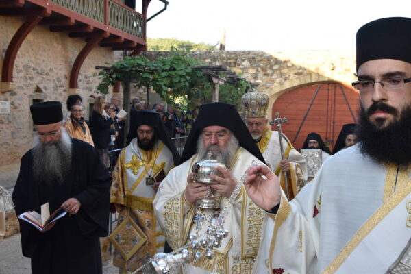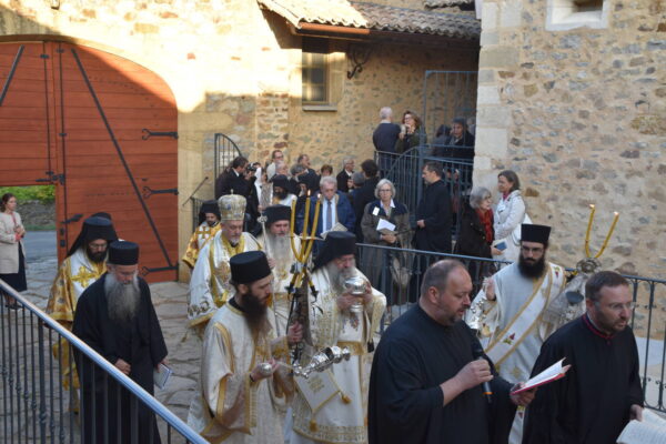 Ο Μητροπολίτης Γαλλίας στην ομιλία του συνέδεσε τα εγκαίνια του Καθολικού με τα εγκαίνια ενός νέου τρόπου ζωής για όλους μας. Μια ζωή απαλλαγμένη από τα πάθη και τις αγκυλώσεις που μας στερούν την εν Χριστώ ζωή. Εξέφρασε την πνευματική κατάνυξη που νιώθει ως ποιμένας, να τον αξιώνει ο Θεός να τελεί τα εγκαίνια αυτά, εκφράζοντας την αγάπη του για την αδελφότητα και τις ακατάπαυστες προσπάθειες της Ι. Μητροπόλεως Γαλλίας να αναπτύξει σε όλες τις γωνιές της χώρας τον ορθόδοξο μοναχισμό, ιδρύοντας συνεχώς νέες Ι. Μόνες. Χαρακτηριστικά είπε “στην Ιερά Μητρόπολη Γαλλίας ιδρύουμε νέα Μοναστήρια και στηρίζουμε με κάθε μέσο τις αδελφότητες που είναι κυριολεκτικά οι πνεύμονες της τοπικής μας εκκλησίας”. Στη συνέχεια αναφέρθηκε στον αγώνα και τις προσπάθειες της αδελφότητας αλλά και στο περιβαλλοντολογικό πρόγραμμα της Ι. Μονής. Συγκεκριμένα ανέφερε “όλοι γνωρίζουμε πόσο σημαντική είναι η προστασία του περιβάλλοντος για όλους μας και εσείς το κάνετε πράξη μέσα από ένα άριστα οργανωμένο και σύμφωνο με τις γαλλικές αρχές πρόγραμμα βιολογικής καλλιέργειας”. Σε άλλο σημείο ανέφερε “ενώνουμε σήμερα τις προσευχές μας για τον μακαριστό π. Πλακίδα που εκοιμήθη τον Ιανουάριο του 2018. Ο μακ. πατέρας Πλακίδας ήταν περισσότερο από πνευματικός πατέρας για πολλούς από εμάς, αφού πέρα από ιδρυτής αυτού του σεβάσμιου μοναστηριού, άφησε πίσω του μια βαριά πνευματική κληρονομιά που στηρίζεται στην παράδοση του ορθόδοξου μοναχισμού στη Γαλλία. Πρέπει επίσης να αναγνωρίσουμε την προφητική διαίσθηση του μακαριστού Γέροντος Αιμιλιανού Σιμωνοπετρίτη για την άνθιση του Μοναχισμού στη Γαλλία, μέσα από το πάντρεμα των πολιτισμών και ενός έμφυτου σεβασμού προς τον γαλλικό πολιτισμό και τη γαλλική γλώσσα. Αυτά τα στοιχεία ενσωματώθηκαν στη ζωή της τοπικής Εκκλησίας, αφήνοντας το Άγιο Πνεύμα να ενεργήσει και να αναδείξει τον γαλλόφωνο ορθόδοξο μοναχισμό. Αυτή η διακονία εν τη Εκκλησία συμβάλλει αναμφισβήτητα στην ακτινοβολία της Ορθοδοξίας στην Ευρώπη και αποτελεί υπακοή στο λόγο του Ευαγγελίου “πορευθέντες μαθητεύσατε πάντα τὰ ἔθνη, βαπτίζοντες αὐτοὺς εἰς τὸ ὄνομα τοῦ Πατρὸς καὶ τοῦ Υἱοῦ καὶ τοῦ Ἁγίου Πνεύματος” (Ματθ. 28, 19-20).