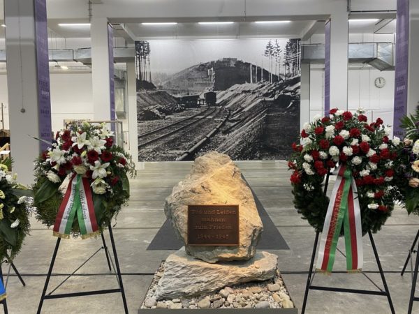 Κεντρικός χώρος εκδηλώσεων του Μουσείου στο KZ-Landsberg. Στο βάθος φωτογραφία από την κατασκευή του υπογείου εργοστασίου πολεμικών αεροπλάνων του Χίτλερ. Στον λίθο του μνημείου είναι τοποθετημένη η επιγραφή: “Θάνατος και Βασανιστήρια θυμίζουν την ειρήνη” (ή προτρέπουν στην ειρήνη) (Φωτογραφία Μαλαμούσης)
