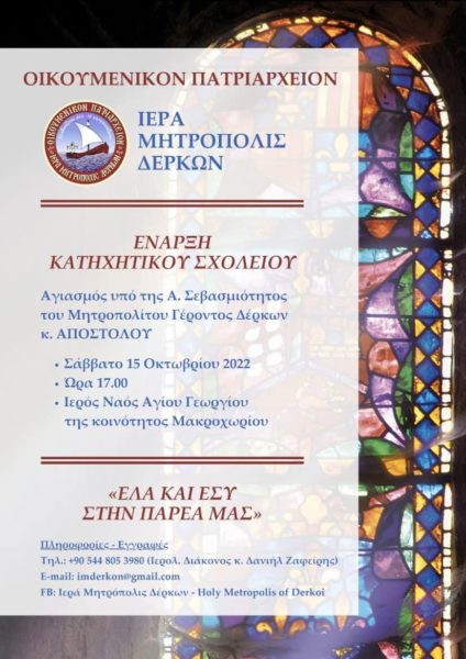 Με αφορμή την έναρξη του Κατηχητικού Σχολείου, ο Μητροπολίτης Γέρων Δέρκων κ. Απόστολος θα τελέσει την Ακολουθία του Αγιασμού στον Ιερό Ναό Αγίου Γεωργίου της κοινότητας Μακροχωρίου, το Σάββατο 15 Οκτωβρίου στις 17:00.