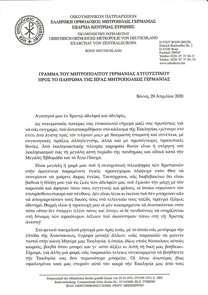 Γράμμα, απέστειλε ο Σεβασμιώτατος Μητροπολίτης Γερμανίας κ. Αυγουστίνος προς το λαό της Ιεράς Μητροπόλεως, όπου συγχαίρει το λαό για την υπομονή και τη συνέπεια που δείχνει και τις θυσίες που έχει κάνει όλη αυτή τη περίοδο με την πανδημία του κορωνοϊού, αλλά και για να τους προτρέψει να συνδράμουν στο έργο των ενοριών τους ώστε να συνεχίσει να υπάρχει η τοπική Εκκλησία στη Γερμανία.