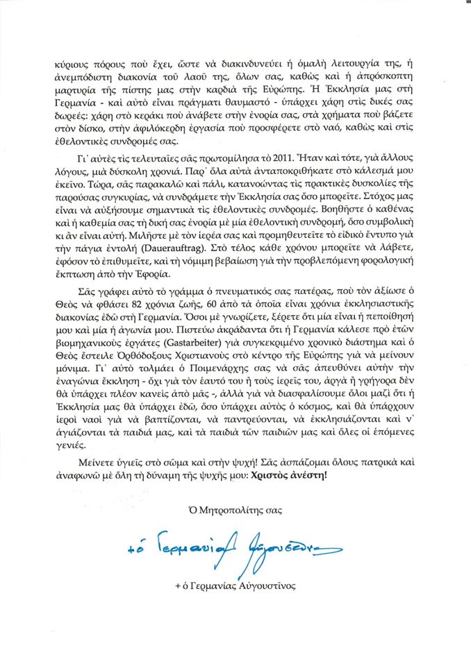 Γράμμα προς τον λαό του Σεβ. Μητρ. Γερμανίας κ. Αυγουστίνου