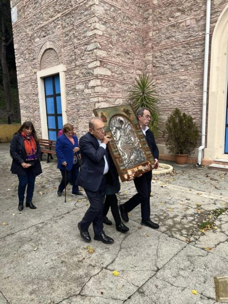 Μετά το πέρας της Θείας Λειτουργίας ακολούθησε η περιφορά της Ιεράς Εικόνος του Αγίου πέριξ του Ιερού Μητροπολιτικού Ναού και ακολούθησε δεξίωση.