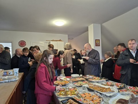 Προ της Απολύσεως, ο Σεβασμιώτατος εξέφρασε τις ευχαριστίες του προς τον ιερατικό προιστάμενο της Ενορίας, π. Robert Szentirmai, για το σπουδαίο ποιμαντικό έργο που επιτελεί, καθώς και για τη μέριμνά του στον καλλωπισμό και την αγιογράφηση του Ιερού Νaoυ. Ακολούθησε εόρτια τράπεζα φιλοξενίας στους χώρους της Ενορίας, όπου ο Σεβασμιώτατος και οι Αρχιερείς είχαν την ευκαιρία να συνομιλήσουν με τους πιστούς.