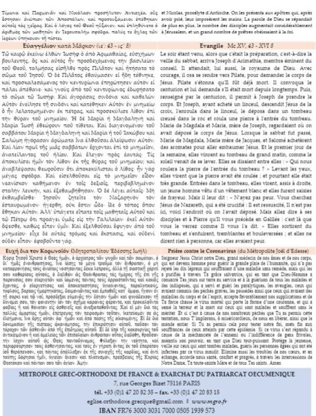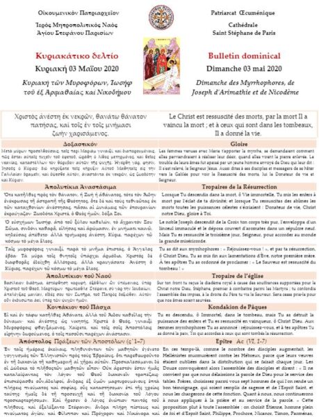 Κυριακάτικο δελτίο – Kυριακή των Μυροφόρων, 03 Μαΐου 2020, στην ελληνική και γαλλική γλώσσα εκ μέρους της Ιεράς Μητροπόλεως Γαλλίας και του Ιερού Μητροπολιτικού Ναού Αγίου Στεφάνου Παρισίων.
