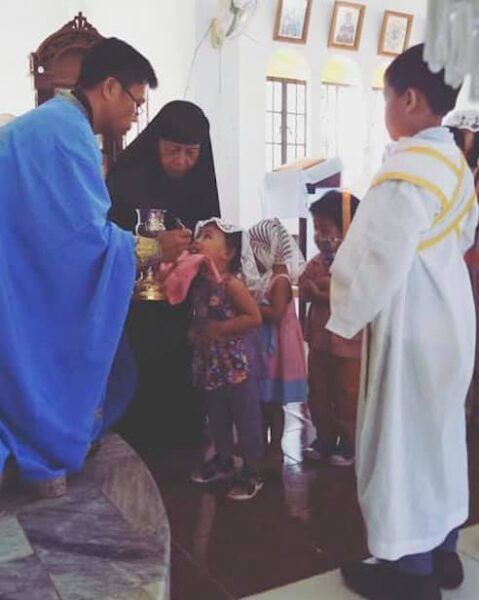 Η Μοναχή Εσθήρ στο Νηπιαγωγείο της Ιεράς Μονής Γενεσίου της Θεοτόκου στο Μασμπάτε – Φιλιππίνες, κατά τη διάρκεια του διακονήματος της φροντίδας, επιμέλειας και ψυχαγώγησης των εκεί παιδικών ψυχών.
