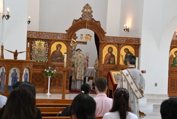 Στο τέλος της θείας Λειτουργίας πραγματοποιήθηκε η λιτανεία της ιεράς εικόνας της Κοιμήσεως της Θεοτόκου στον προαύλιο χώρο του ιερού ναού.