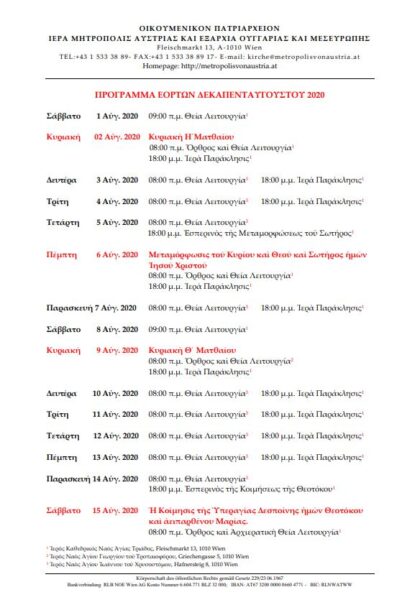 ΙΕΡΑ ΜΗΤΡΟΠΟΛΗ ΑΥΣΤΡΙΑΣ ΚΑΙ ΕΞΑΡΧΙΑ ΟΥΓΓΑΡΙΑΣ ΚΑΙ ΜΕΣΕΥΡΩΠΗΣ – Επισυνάπτεται το Λειτουργικό Πρόγραμμα για τις ημέρες του Δεκαπενταύγουστου: