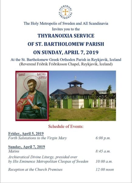 21/03/2019 21/03/2019 Ο Σεβασμιώτατος Μητροπολίτης Σουηδίας, κ. Κλεόπας, δημοσιεύει την πρόσκληση προς το ευσεβές πλήρωμα ενόψει των επερχομένων θυρανοιξίων της υπό ίδρυσιν Ενορίας του Αγίου Ενδόξου Αποστόλου Βαρθολομαίου στο Ρέϊκιαβικ της Ισλανδίας:   ΠΡΟΣΚΛΗΣΗ ΣΤΑ ΘΥΡΑΝΟΙΞΙΑ ΤΗΣ ΕΝΟΡΙΑΣ ΤΟΥ ΑΠΟΣΤΟΛΟΥ ΒΑΡΘΟΛΟΜΑΙΟΥ ΣΤΟ ΡΕΙΚΙΑΒΙΚ ΤΗΣ ΙΣΛΑΝΔΙΑΣ   Κυριακή, 7 Απριλίου 2019 Αγαπητοί μου, Με ιδιαίτερη χαρά επικοινωνώ μαζί...