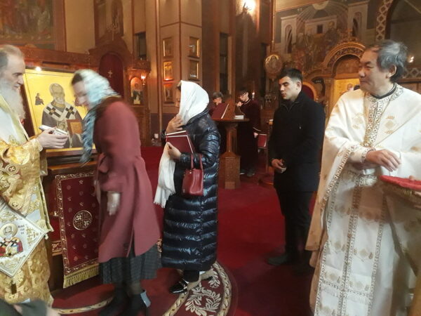ΣΕΟΥΛ – Την Κυριακή 1η Δεκεμβρίου πριν από την Απόλυση της θείας Λειτουργίας στον Καθεδρικό Ιερό Ναό έγινε η μεταφορά της εικόνας και των Ιερών Λειψάνων του αγίου Νικολάου στο κέντρο του Ναού και ψάλθηκε ειδική δέηση. Κατόπιν μοιράστηκαν εκ μέρους του αγίου Νικολάου δώρα στα παιδιά. Μετά το κοινό γεύμα αγάπης οι πιστοί και ιδίως οι νέοι και οι νέες της ομάδας του Συνδέσμου εργάστηκαν για την καθαριότητα του ναού και τον χριστουγεννιάτικο στολισμό του Ιεραποστολικού Κέντρου και των δένδρων στον προαύλιο χώρο.
