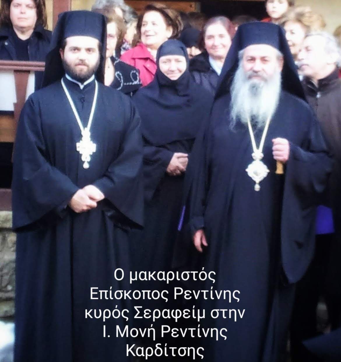 Ο Επίσκοπος Μελιτηνής ετέλεσε επίσης Τρισάγιο υπέρ αναπαύσεως της ψυχής του μακαριστού Επισκόπου Ρεντίνης κυρού Σεραφείμ (Καλογερόπουλου) με τον οποίο συνδεόταν πνευματικά και ο οποίος εκοιμήθη πριν πέντε έτη (16.04.2016) και κηδεύτηκε σαν σήμερα. Ενταφιάστηκε δε στον προαύλιο χώρο του Ι. Ναού Αγίας Παρασκευής Καρδίτσης.