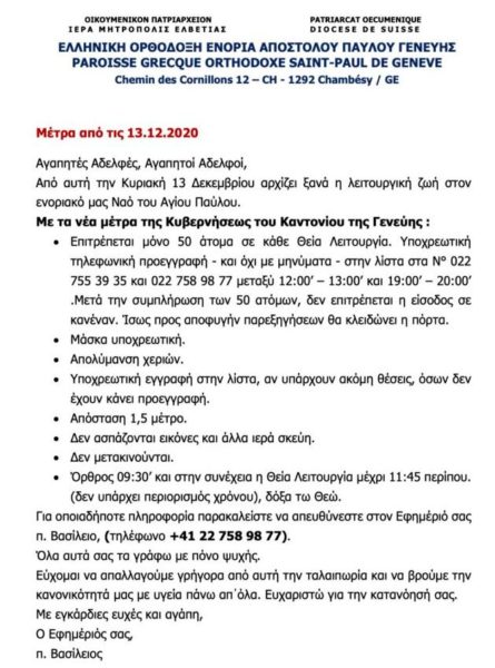 Η Ιερά Μητρόπολη Ελβετίας και η Ελληνορθόδοξη Ενορία του Αποστόλου Παύλου στη Γενεύη αναφέρει ότι το Καντόνι της Γενεύης από την Κυριακή 13 Δεκεμβρίου επιτρέπει τη λειτουργική ζωή όμως θα πρέπει να τηρηθούν αυστηρά μέτρα προστασίας από τον κορωνοϊό. Συγκεκριμένα θα εισέρχονται στους Ιερούς Ναούς μέχρι 50 άτομα ενώ θα πρέπει να έχει γίνει υποχρεωτικά τηλεφωνική προεγγραφή. Ακόμα δεν υπάρχει η δυνατότητα μετακίνησης εντός των ναών και δεν επιτρέπεται να ασπάζονται οι πιστοί της Εικόνες ενώ η χρήση μάσκας είναι υποχρεωτική σε όλη τη διάρκεια της παραμονής τους στον Ιερό Ναό.