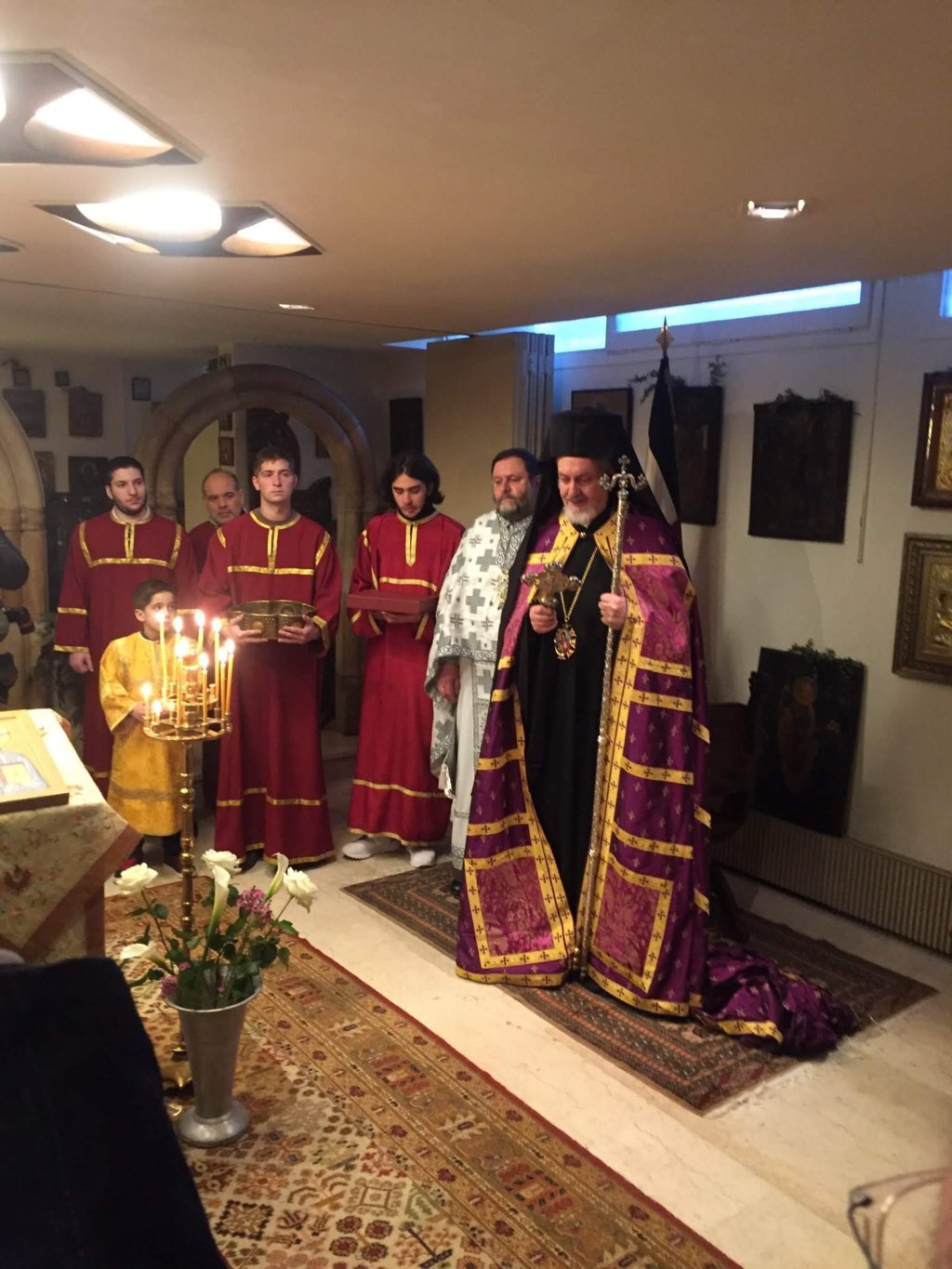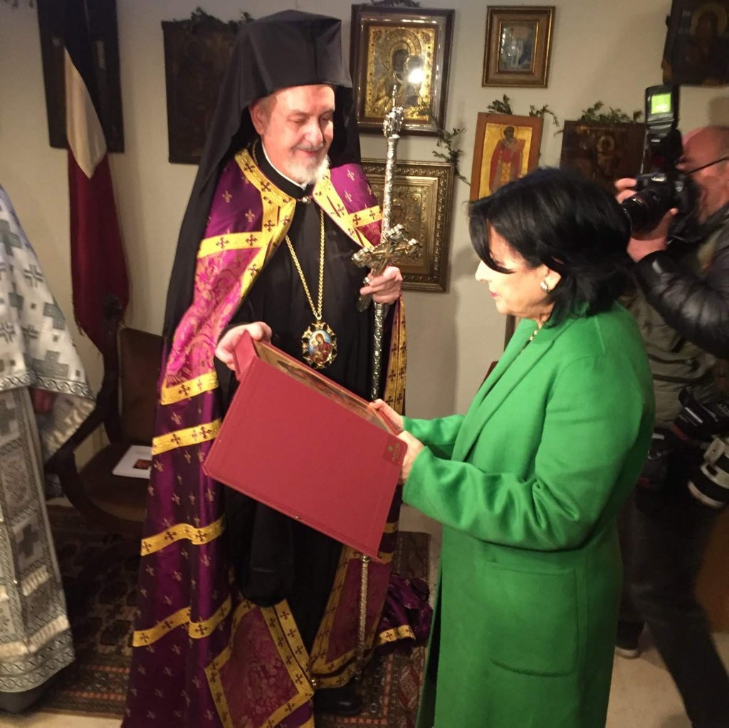 Ο Σεβασμιώτατος καλωσόρισε την κ. Πρόεδρο στην ενορία της Αγίας Νίνας η οποία υπάγεται στο Οικουμενικό Πατριαρχείο και στην Ιερά Μητρόπολη Γαλλίας εδώ και 90 χρόνια. Υπογράμμισε ότι ο πατέρας της κ. Προέδρου είναι ένας εκ των ιδρυτών της ενορίας και εξέφρασε την υπερηφάνεια της κοινότητας και της Ιεράς Μητροπόλεως, που η κ. Zurabishvili ανήλθε στον υψηλότατο βαθμό της Προέδρου της Γεωργίας.