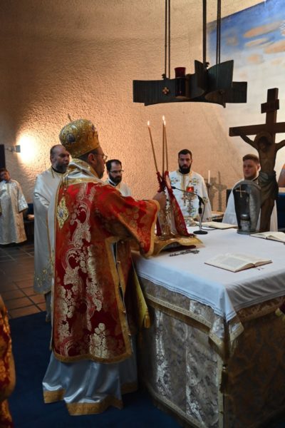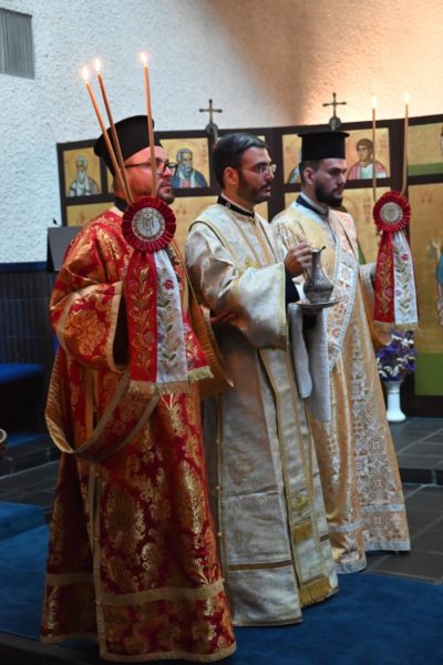 Συλλειτουργοί του προεξάρχοντος Ιεράρχου παρέστησαν οι Πανοσιολ. Αρχιμανδρίτης κ. Φανούριος Θολιώτης και Αιδεσιμολ. Πρωτοπρεσβύτερος κ. Βασίλειος Κοτρότσιος, Πρωτοσύγκελλος και Γεν. Αρχιερατικός της Ι. Μητροπόλεως Ελβετίας, αντιστοίχως, οι Πανοσιολ. Αρχιμανδρίτες κ.κ. Φιλάδελφος Καφαλής, Πρωτοσύγκελλος της Ι. Μητροπόλεως Βελγίου, και Ματθαίος Λαδάς, οι Αιδεσιμολ. Πρωτοπρεσβύτεροι κ.κ. Σωτήριος Bushi και Αθανάσιος Τοπαρλάκης, Ιερ. Προϊστάμενος του Μητροπολιτικού Ναού Βρυξελλών, οι Οσιολ. ελληνομαθείς ιερομόναχοι κ.κ. Ειρηναίος και Ιερώνυμος, φοιτητές του Ινστιτούτου του Bossey, εκ της Εκκλησίας της Γεωργίας, και οι Ιερολ. διάκονοι κ.κ. Γαβριήλ Baratashvili, Αρχιδιάκονος του Ποιμενάρχου, και Σεραφείμ Σιγιάννης, φοιτητής του Ινστιτούτου Μεταπτυχιακών Σπουδών του Ορθοδόξου Κέντρου.