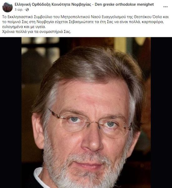 “Το Εκκλησιαστικό Συμβούλιο του Μητροπολιτικού Ναού Ευαγγελισμού της Θεοτόκου Όσλο και το ποίμνιό Σας στη Νορβηγία εύχεται Σεβασμιώτατε τα έτη Σας να είναι πολλά, καρποφόρα, ευλογημένα και με υγεία. Χρόνια πολλά για τα ονομαστήριά Σας”.