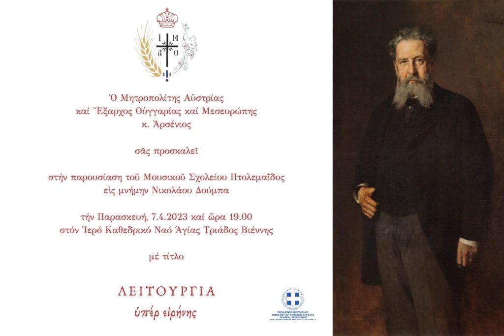 Ο Σεβασμιώτατος Μητροπολίτης Αυστρίας και Έξαρχος Ουγγαρίας και Μεσευρώπης κ. Αρσένιος προσκαλεί στην παρουσίαση του Ορατορίου με τίτλο «Λειτουργία υπέρ ειρήνης», που διοργανώνεται από το Μουσικό Σχολείο Πτολεμαίδος, στη μνήμη του μεγάλου Δωρητή, Προστάτη των Τεχνών και των Γραμμάτων, και Κτήτορα του Ιερού Ναού Αγίου Γεωργίου Βιέννης, Νικολάου Δούμπα.