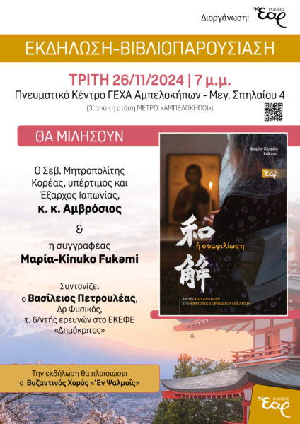 Ο Μητροπολίτης Κορέας και Έξαρχος Ιαπωνίας κ. Αμβρόσιος ομίλησε στην εκδήλωση- βιβλιοπαρουσίαση «Η συμφιλίωση – Από την Άπω Ανατολή στην Ανατολική Ορθόδοξη Εκκλησία», την Τρίτη 26 Νοεμβρίου, στο Πνευματικό Κέντρο της Γ.Ε.Χ.Α. Αμπελοκήπων παρουσία πλήθους κόσμου και σε ιδιαίτερα ζεστό κλίμα.