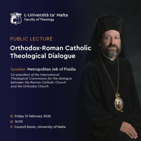 Με την ευκαιρία της εδώ παραμονής του ο Σεβ. κ. Ιώβ ομίλησε στη Θεολογική Σχολή με θέμα το διάλογο μεταξύ Ορθοδόξου και Ρωμαιοκαθολικής Εκκλησίας, δεχθείς και απαντήσας στις ερωτήσεις των ακροατών. Ο Σεβ. κ. Ιώβ είναι Συμπρόεδρος της Επιτροπής του διαλόγου αυτού. Την εκδήλωση παρακολούθησαν ο Αρχιεπίσκοπος Μάλτας, Καθηγητές και Φοιτητές της Θεολογικής Σχολής.