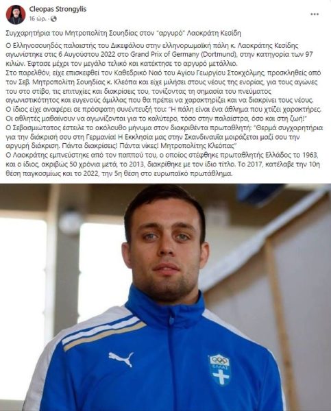 Με μήνυμα του σε μέσο κοινωνικής δικτύωσης, o Σεβασμιώτατος Μητροπολίτης Σουηδίας κ. Κλεόπας συνεχάρη τον αθλητή για την επιτυχία του.