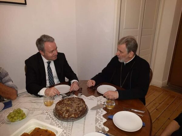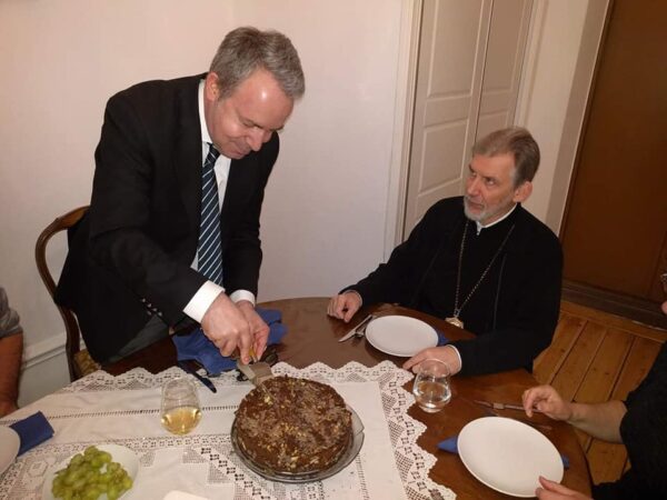 Ο κ. Πρέσβυς προσκύνησε στον ναό και στη συνέχεια οδηγήθηκε στη μικρή τραπεζαρία, όπου ομάδα εθελοντών του ναού είχαν ετοιμάσει νηστήσιμο γεύμα, η δε Πρόεδρος της Φιλοπτώχου Αδελφότητος Κυριών, κ. Φωτεινή Μπατσέλα, προσέφερε τούρτα προς τιμήν του υψηλού επισκέπτη.