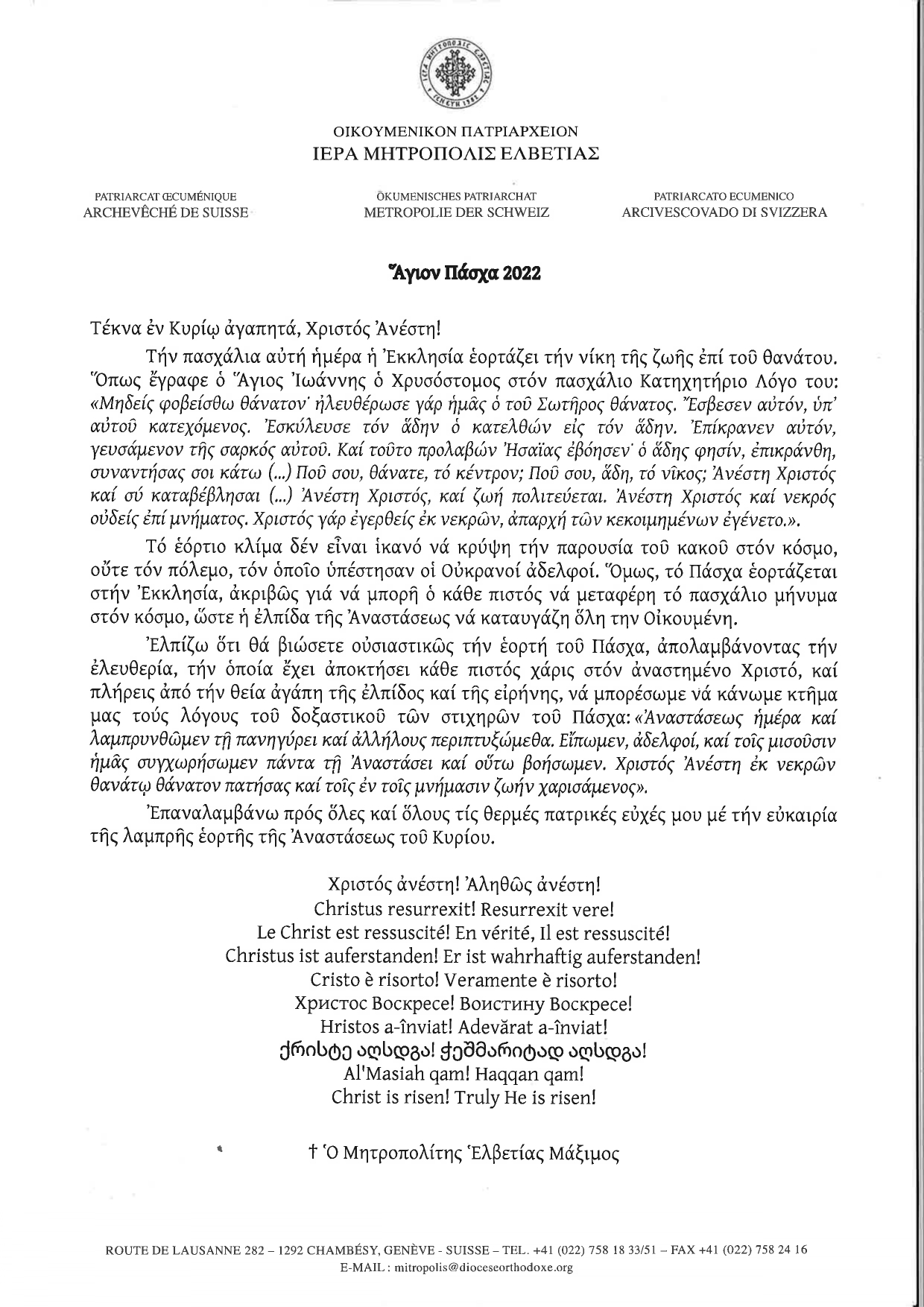 Αναλυτικά, το Πασχάλιο Mήνυμα του Σεβασμιωτάτου Μητροπολίτη Ελβετίας κ. Μάξιμου αναφέρει τα εξής (διαβάστε σε μορφή PDF ΕΔΩ):