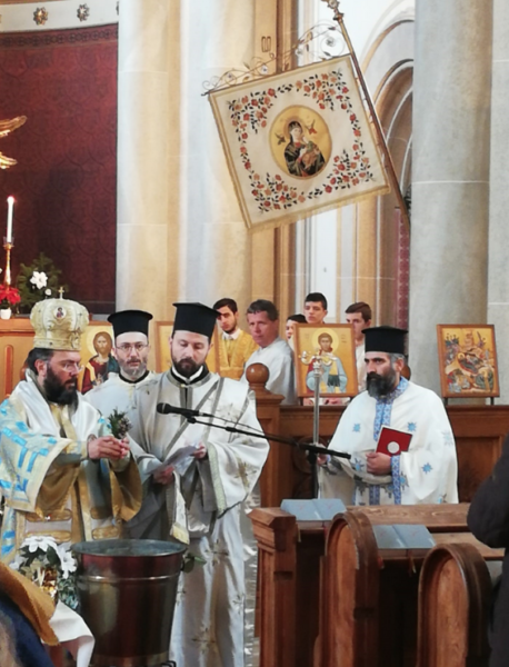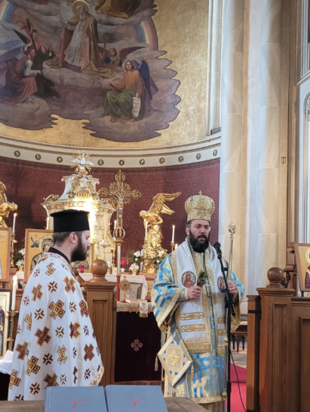 Ο Σεβασμιώτατος Μητροπολίτης Αυστρίας και Έξαρχος Ουγγαρίας κ. Αρσένιος προεξήρχε της Θείας Λειτουργίας στον μεγαλοπρεπή Ενοριακό Ναό της Παναγίας συμπαραστατούμενος από τον π. Νεμάνια Komnenov, ιερατικώς Προιστάμενο και τον π. Στέφανο Lorbek, Διάκονο της Ενορίας καθώς και τον πρεσβύτερο π. Αριστείδη Γανώση και τον Αρχιδιάκονο π. Μάξιμο Rugyko.