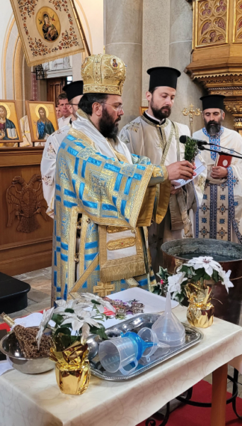 Μετά το τέλος της Θείας Λειτουργίας ο Αρχιερέας, συμπαραστατούμενος από τους Ιερείς και τους Διακόνους, τέλεσε εντός του Ι. Ναού την Ακολουθία του Μεγάλου Αγιασμού και αγίασε το πλήρωμα.