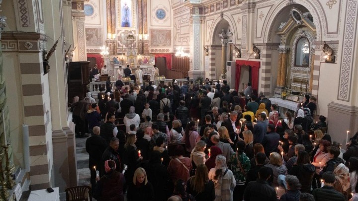 Πραγματική Λαμπρή στη Σμύρνη, την ιστορική πρωτεύουσα της Μικράς Ασίας. Η τελετή της Αναστάσεως, η Αναστάσιμη Θεία Λειτουργία και ο Εσπερινός της Αγάπης πραγματοποιήθηκαν στη γεμάτη από κόσμο καινούργια για την Ορθόδοξη Μητρόπολη Σμύρνης εκκλησιά της Παναγίας. Πρόκειται για τον ιστορικό ναό της Παναγίας (Santa Maria) στο Κόνακ. Στο ιστορικό Κονάκι κοντά στη Σμυρνιά προκυμαία.