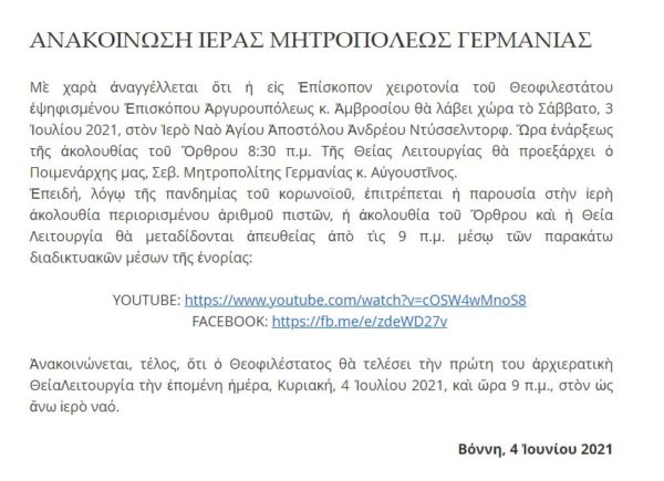 Σύμφωνα με επίσημη ανακοίνωση της Ιεράς Μητροπόλεως Γερμανίας, η εις Επίσκοπον χειροτονία του Θεοφιλεστάτου εψηφισμένου Επισκόπου Αργυρουπόλεως κ. Αμβροσίου θα λάβει χώρα το Σάββατο, 3 Ιουλίου 2021, στον Ιερό Ναό Αγίου Αποστόλου Ανδρέου Ντύσσελντορφ. Ώρα ενάρξεως της ακολουθίας του Όρθρου 8:30 π.μ.