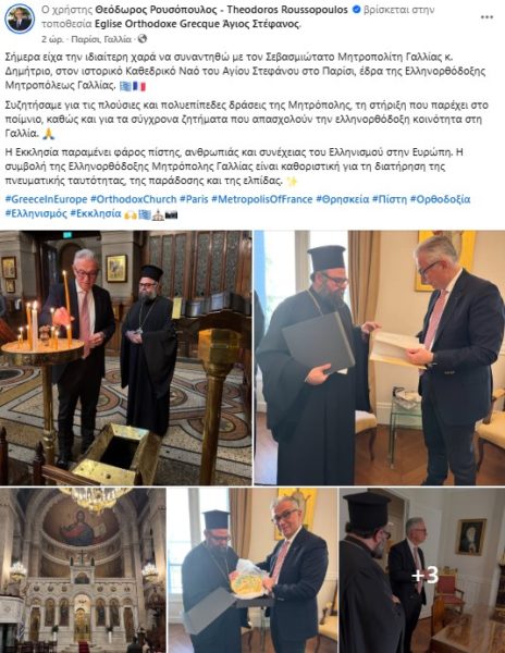 «Η Εκκλησία παραμένει φάρος πίστης, ανθρωπιάς και συνέχειας του Ελληνισμού στην Ευρώπη. Η συμβολή της Ελληνορθόδοξης Μητρόπολης Γαλλίας είναι καθοριστική για τη διατήρηση της πνευματικής ταυτότητας, της παράδοσης και της ελπίδας», αναφέρει χαρακτηριστικά και μεταξύ άλλων το σχετικό μήνυμα του κ. Ρουσόπουλου σε μέσο κοινωνικής δικτύωσης.