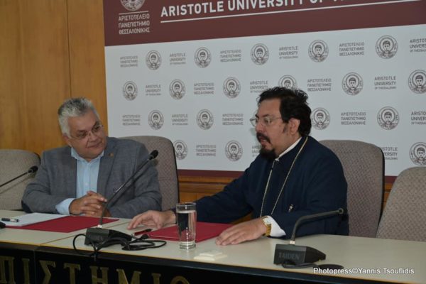 Απευθυνόμενος στον Σεβασμιώτατο Μητροπολίτη, ο Πρύτανης του ΑΠΘ επισήμανε ότι «είναι τιμή για εμάς στη θέση που είστε να μιλάτε την ελληνική γλώσσα που σημαίνει ότι, στα μέρη όπου διακονείτε, μεταφέρεται όχι μόνο η ελληνική γλώσσα αλλά και ο ελληνικός πολιτισμός».