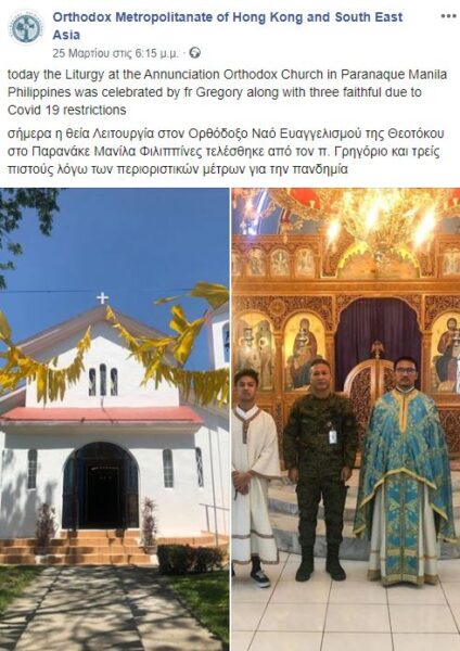 Κατά την 25η Μαρτίου 2020, η θεία Λειτουργία στον Ορθόδοξο Ναό Ευαγγελισμού της Θεοτόκου στο Παρανάκε, Μανίλα, Φιλιππίνες τελέσθηκε από τον π. Γρηγόριο και τρείς πιστούς λόγω των περιοριστικών μέτρων για την πανδημία, από όπου η μικρά δέσμη φωτογραφικών στιγμιοτύπων.