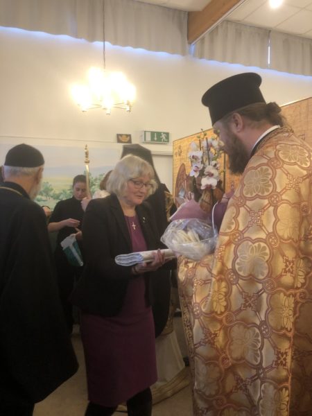 Θα ήθελα, επίσης, να ευχαριστήσω τον Πανοσιολογ. Αρχιμανδρίτη κ. Σωσίπατρο Στεφανούδη, ο οποίος, μέχρι τώρα, εξυπηρετούσε τις λειτουργικές και πνευματικές ανάγκες της νεοσύστατης ενορίας, και τον Πανοσιολογ. Αρχιμανδρίτη κ. Βαρθολομαίο Ιατρίδη, ο οποίος είχε την καλοσύνη, να με συνοδεύσει από την Στοκχόλμη.
