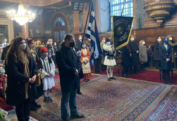 Μετά το πέρας της Δοξολογίας και αφού εψάλη ο Εθνικός Ύμνος, το καθόλου εκκλησίασμα πορεύθηκε προς τον Ι.Ν. του Αγίου Γεωργίου, όπου στο μνημείο του Ρήγα Βελεστινλή τελέστηκε νεκρώσιμο Τρισάγιο υπέρ των ηρωικώς αγωνισαμένων και ενδόξως πεσόντων εν τη Εθνική Παλιγγενεσία και ακολούθησε κατάθεση στεφάνων, απόδοση τιμών και η ανάκρουση του Εθνικού μας Ύμνου με τον Σεβασμιώτατο να εύχεται σε όλες κι όλους πλούσια την χάρη του Τριαδικού Θεού υπό την σκέπη της Υπεραγίας Θεοτόκου.